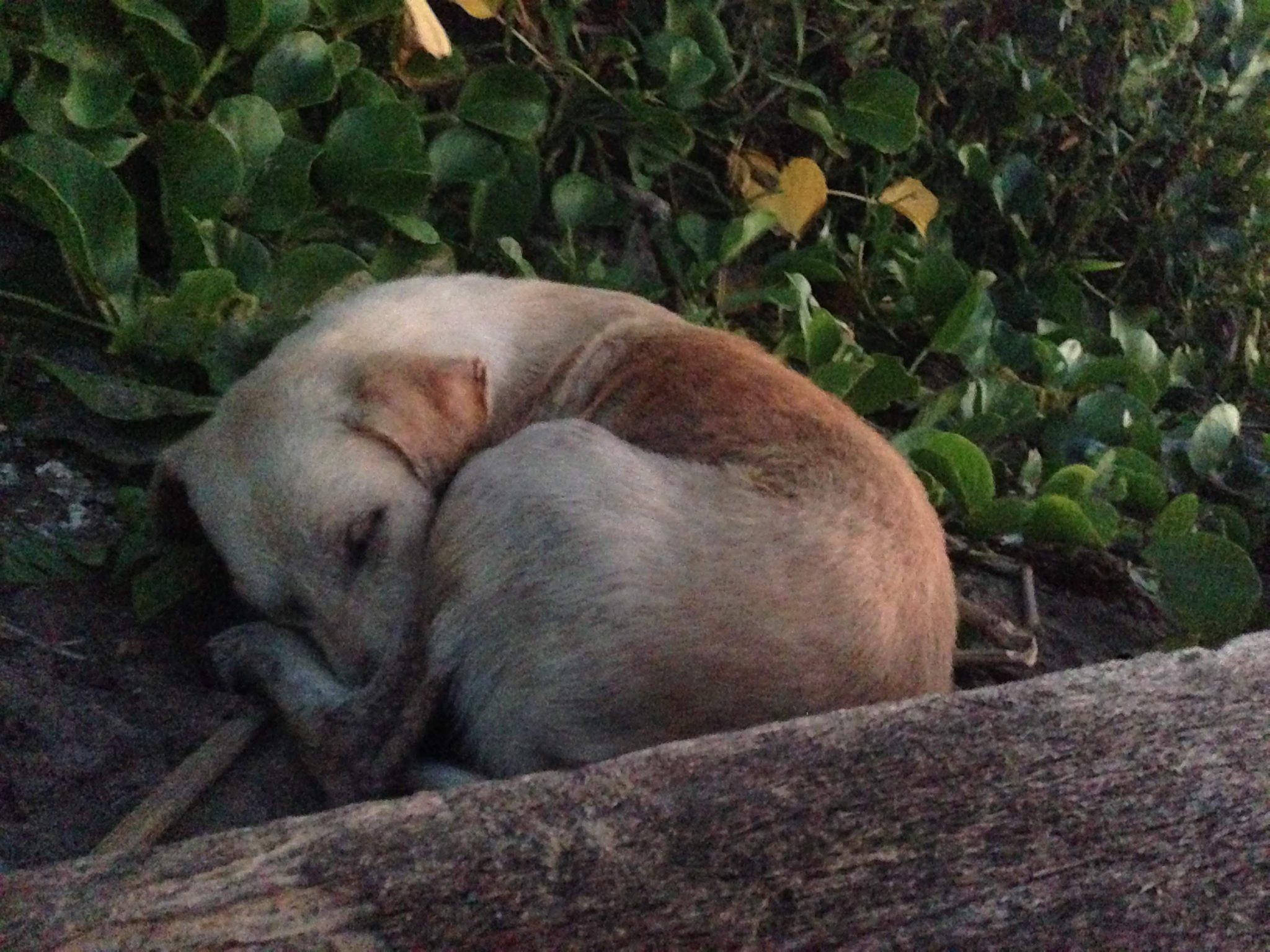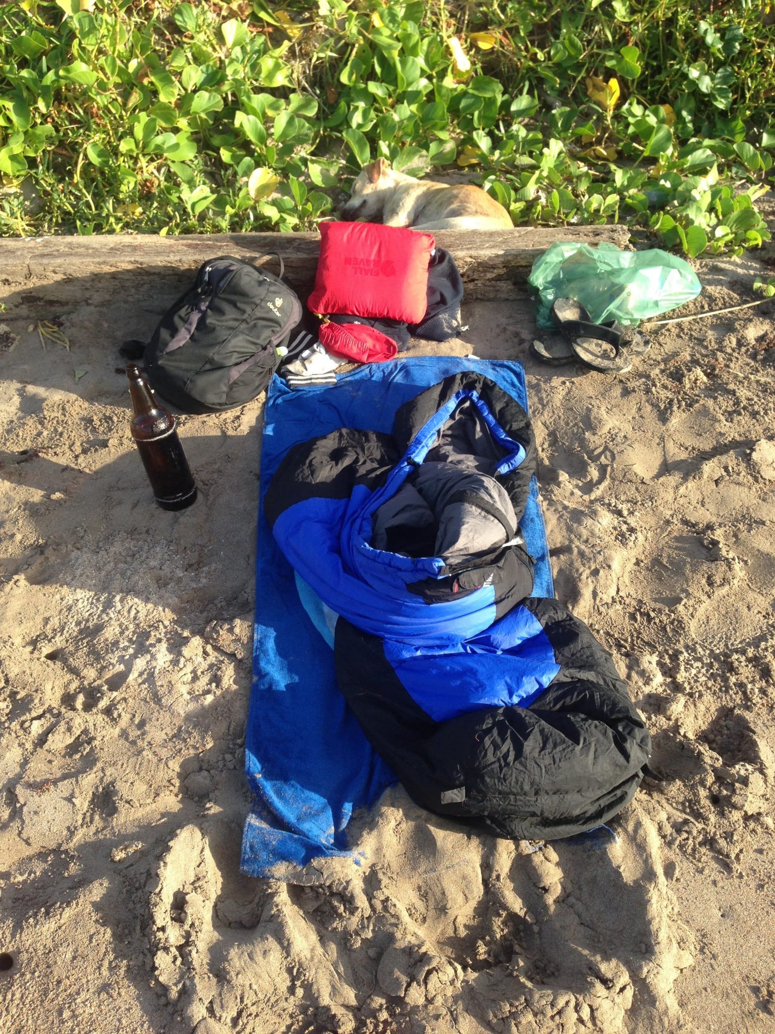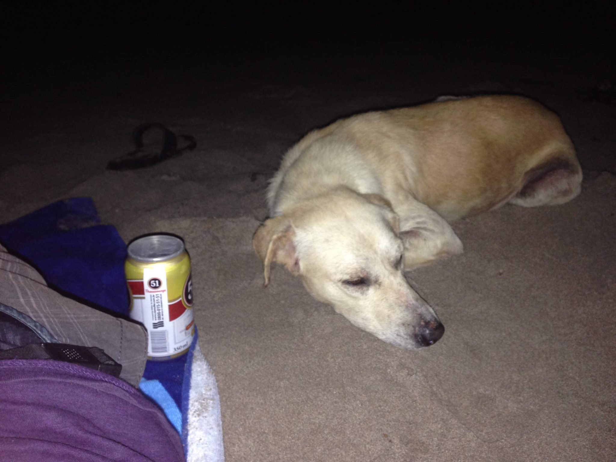 Me voilà parti, en direction de la plage, avec un bout de pain mou (il n’y a pas de pain normal), une canette de cachaça et une bouteille d’un litre de bière. Une fois sorti, un chien est tout de suite venu me tenir compagnie. Il ne m’a pas laissé de la nuit et a même dormi à mes côtés sur la plage. C’est même moi qui ai dû le réveiller au lever du soleil.